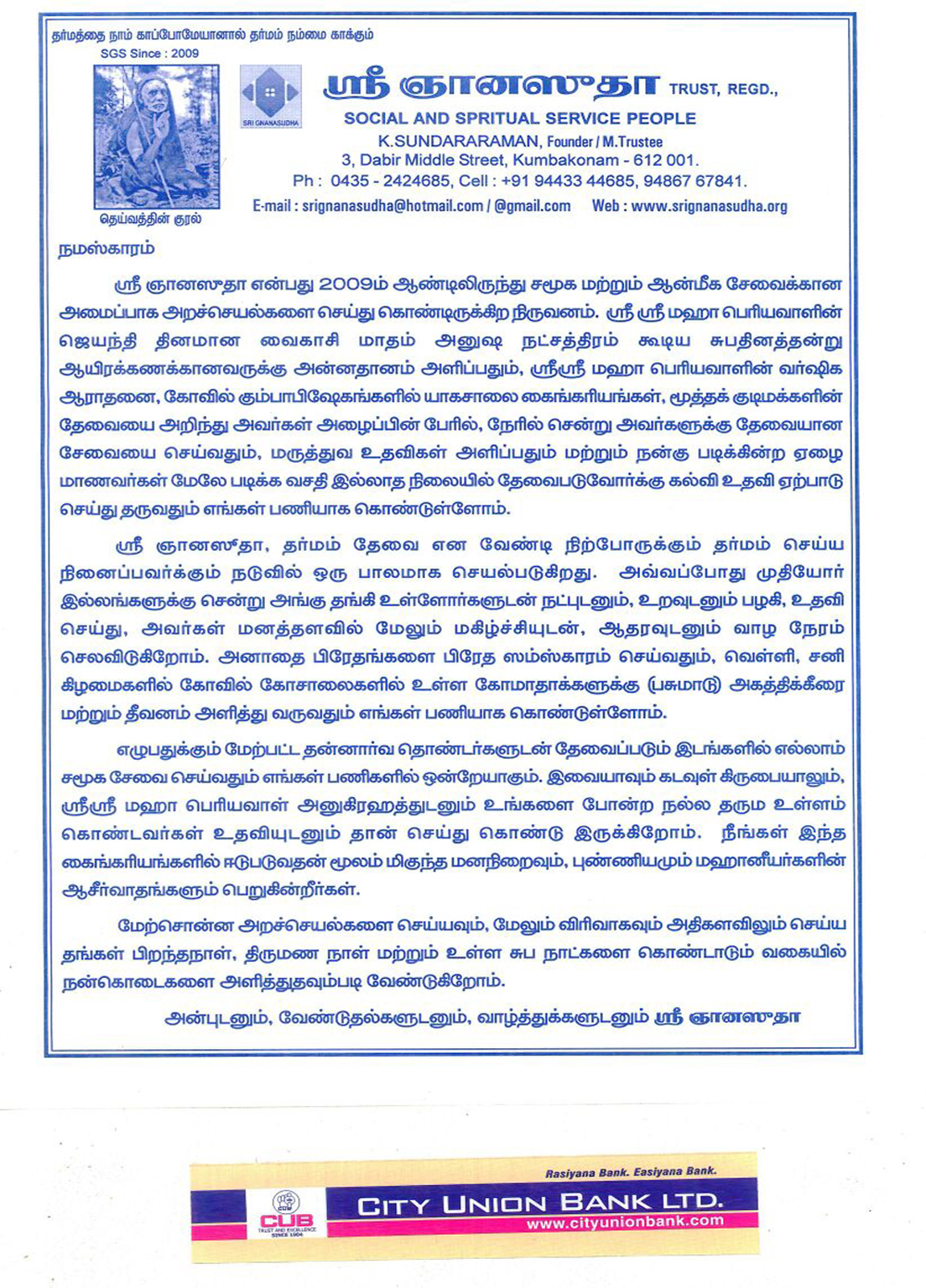 Sri Gnanasudha provides all sorts of help to the distressed people of the home and help them for their peace. This service team helps the last rikes of cremation to the given up people. The service team visit temples of in and around Kumbakonam on Friday and Saturdays and provides FODDER and GRASS feed for the cows in the temple COW shead.